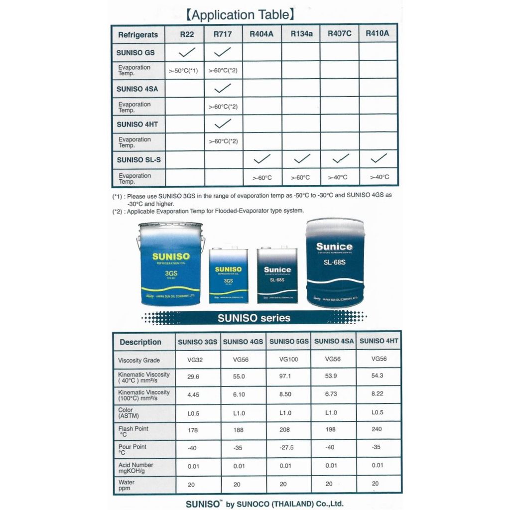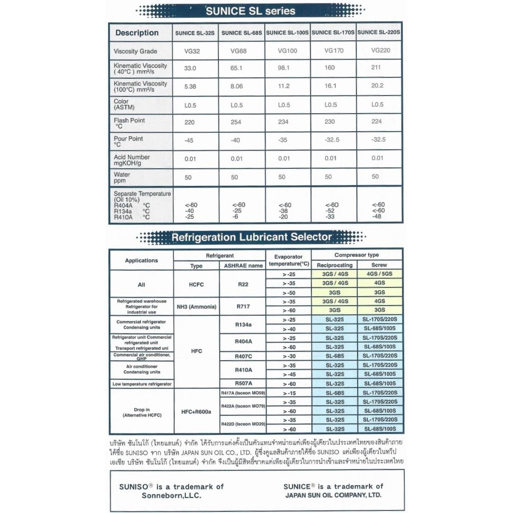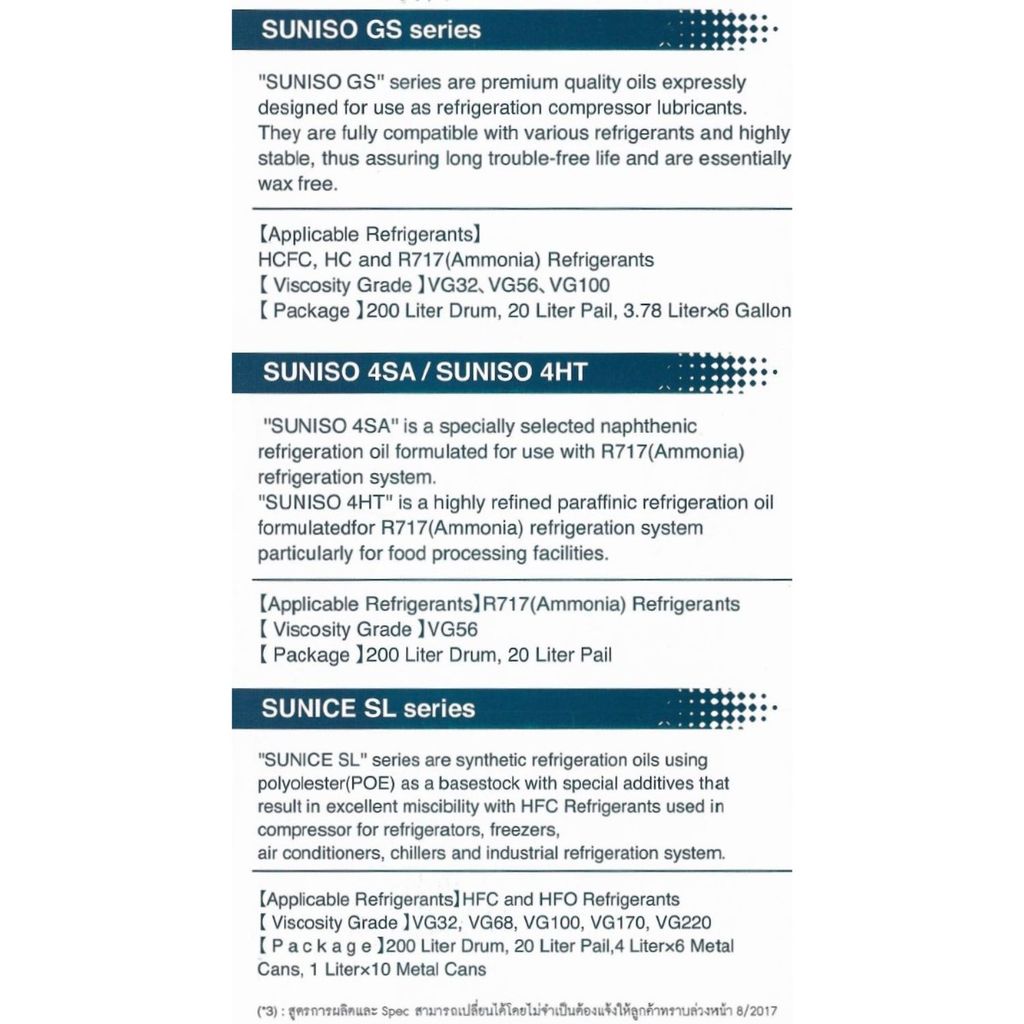 น้ำมันซีรียส์ “SUNICE SL-S” ถูกออกแบบมาเพื่อใช้กับคอมเพรสเซอร์หลายรุ่น ของระบบทำความเย็นแบบ HFC ที่ใช้น้ำยา R-134a, R-404A, R-407C, R-410A มีคุณสมบัติ หล่อลื่น, ต่อต้านการแยกสลาย และป้องกันการสึกกร่อนได้อย่างดีเยี่ยม